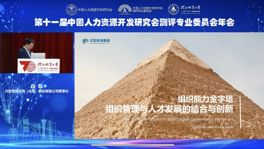 作為專委會常務理事,漢哲咨詢首席專家段磊博士受邀參加年會并于21日下午在大會發(fā)表了題為《組織能力金字塔-組織管理與人才發(fā)展的結(jié)合與創(chuàng)新》的主題發(fā)言,系統(tǒng)介紹了漢哲自主研發(fā)的“組織能力金字塔”模型及其應用實踐,得到了與會專家的一致好評。10月22日,段磊博士參加了《人才發(fā)展現(xiàn)代化賦能高質(zhì)量發(fā)展》分論壇活動,并作為嘉賓為參加研討的各位報告人進行了專業(yè)的點評。