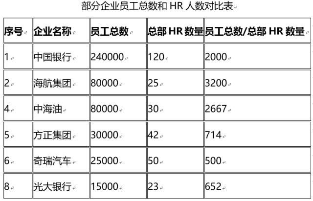 隨著企業(yè)員工總數(shù)的增加,每個(gè)HR人員服務(wù)的員工數(shù)應(yīng)該呈上升趨勢,且企業(yè)規(guī)模越大,上升趨勢應(yīng)更為明顯。據(jù)有關(guān)研究顯示,HR人員和企業(yè)員工總數(shù)之間的比例有一定的標(biāo)準(zhǔn),下表列舉了部分企業(yè)的實(shí)例。