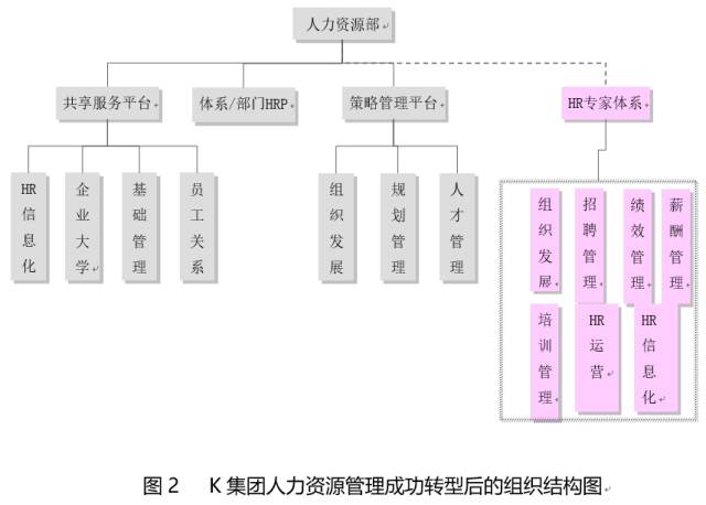 在這個組織結(jié)構(gòu)圖中,保留了K集團人力資源管理的三級架構(gòu),明確了總部人力資源作為共享服務平臺、策略管理平臺、HR專家體系的三大目標。