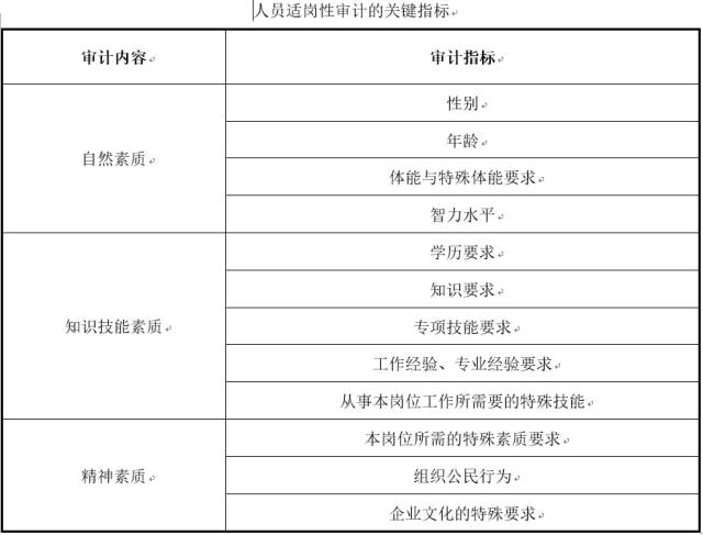 對(duì)于人員適崗性的評(píng)價(jià)的基礎(chǔ),是崗位任職資格標(biāo)準(zhǔn)。所謂任職資格標(biāo)準(zhǔn),是勝任本崗位工作所需要的知識(shí)、經(jīng)驗(yàn)、技能與素質(zhì),也可以歸納為自然素質(zhì)、知識(shí)技能素質(zhì)與精神素質(zhì)三個(gè)維度,其審計(jì)的關(guān)鍵指標(biāo)如下表所示: