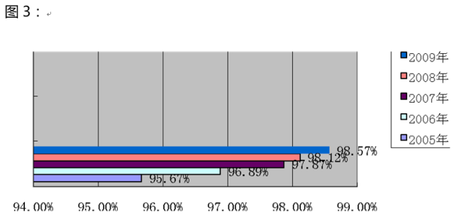 X公司產(chǎn)品質(zhì)量用“一次交檢合格率”來表示,統(tǒng)計顯示:X公司一次交檢合格率2005年為96.77%,2006年為97.52%,2007年為98.17%,2008年為98.23%,2009年為98.78%,如下圖所示。從行業(yè)來看,一次交驗合格率高于99%屬于最高質(zhì)量水平,90-98%之間屬于高質(zhì)量水平,從近五年質(zhì)量合格率可以看出,X公司產(chǎn)品質(zhì)量處于高質(zhì)量水平,但距最高質(zhì)量水平,還有一定的差距.