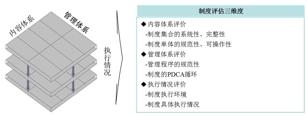 制度的核心包括內(nèi)容體系、管理體系和執(zhí)行情況三個(gè)維度,制度評(píng)估也應(yīng)與此相對(duì)應(yīng),由此我們提出了“制度評(píng)估度三維模型”,如圖所示: