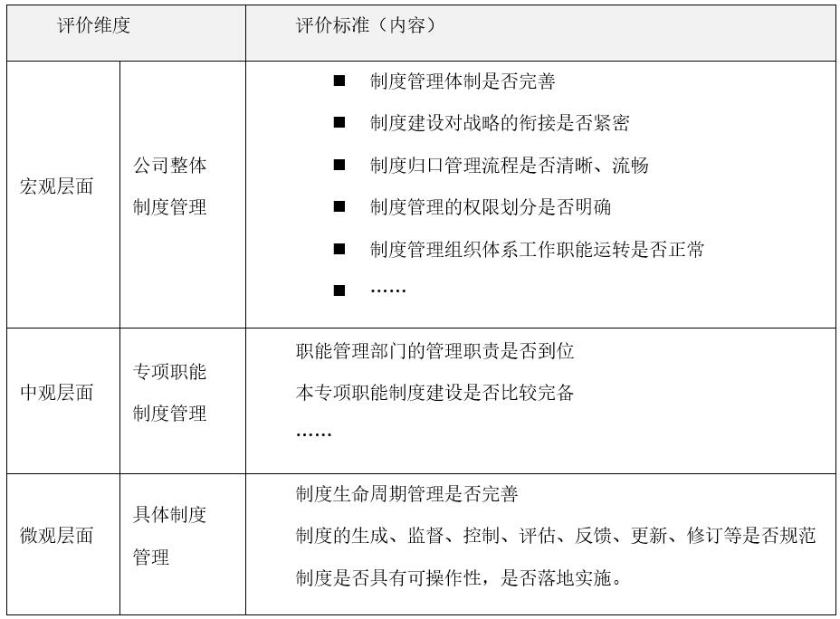 對(duì)于制度管理體系的評(píng)估,通常從宏觀管理(企業(yè)總體制度管理)、中觀管理(專項(xiàng)職能制度管理)和微觀管理(單體制度管理)三個(gè)層面進(jìn)行分類評(píng)估,每個(gè)層面評(píng)估工作的側(cè)重點(diǎn)不同,其中: