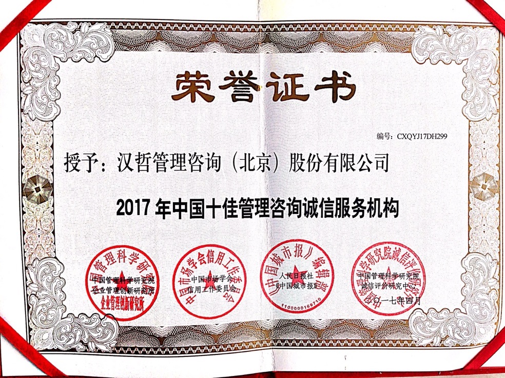 鑒于漢哲管理咨詢(北京)股份有限公司在管理咨詢領(lǐng)域率先推出免費三年服務(wù)、推出成果百分百落地措施、率先通過ISO9001質(zhì)量體系認證、率先杜絕掛靠行為等行動,以及由此對于企業(yè)誠信建設(shè)的示范意義,大會授予漢哲管理咨詢“2017年中國十佳管理咨詢誠信服務(wù)機構(gòu)”榮譽稱號。