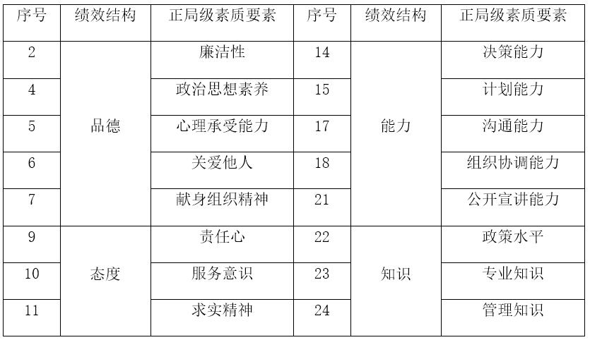 經(jīng)過上述素質(zhì)模型的建模過程,內(nèi)外部專家最終篩選出了16項(xiàng)素質(zhì)進(jìn)入局級(jí)正職領(lǐng)導(dǎo)干部的素質(zhì)模型中,形成4項(xiàng)素質(zhì)緯度,即品德、能力、態(tài)度和知識(shí)。另外,研究者經(jīng)過訪談,征詢了部分委辦局有關(guān)領(lǐng)導(dǎo)及工作人員的意見,又加入了政治思想素養(yǎng)、心理承受能力、關(guān)愛他人、獻(xiàn)身組織精神、公開宣講能力、組織協(xié)調(diào)能力等8項(xiàng)素質(zhì),最終修訂并建立起××市直系統(tǒng)局級(jí)正職領(lǐng)導(dǎo)干部的素質(zhì)模型,24項(xiàng)素質(zhì)。